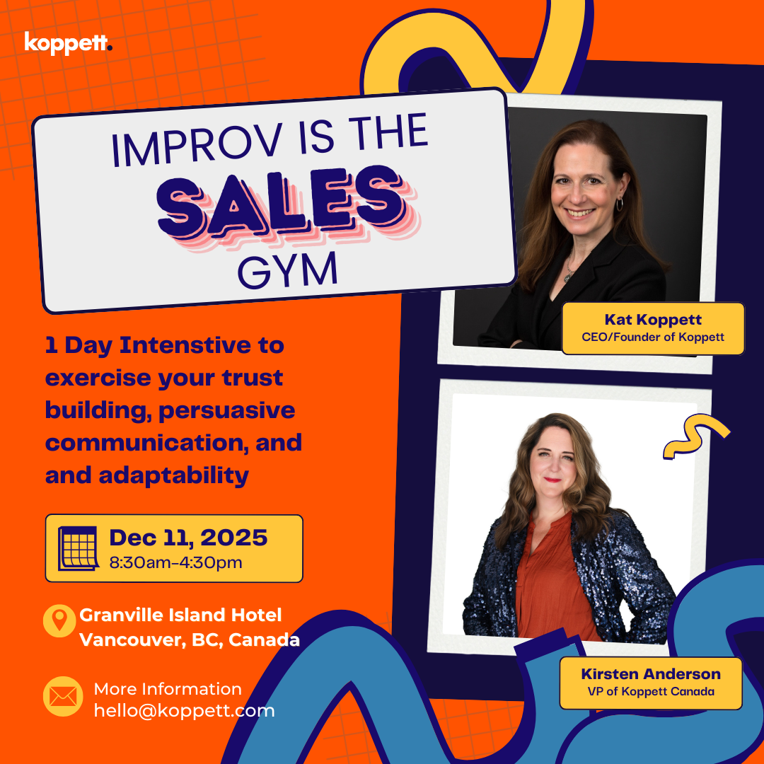 No matter what your current role or experience level, this unique course will help set you apart with greater trust building skills, improved listening, and persuasiveness. In a one day intensive you will “work out” in the improv gym your sales muscles in new ways to propel you on your leadership journey. As an inspiring sales professional you will walk away stronger and ready to communicate with new found clarity and purpose.